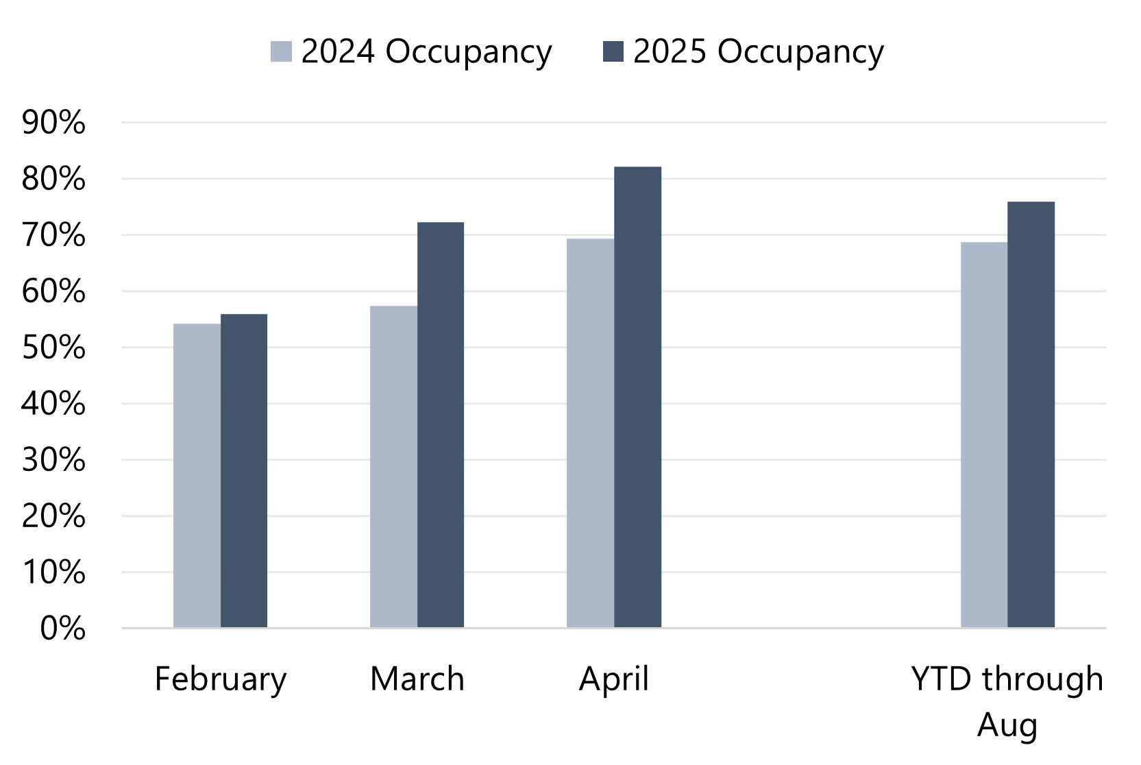 The improvements in the submarket demand levels have continued during the year-to-date 2025 period. The submarket’s occupancy through August registered at nearly 76.0%, an increase from the 68.7% recorded in the same period of 2024. The following graphic illustrates the comparative monthly occupancy metrics of this competitive submarket for 2024 and 2025 in the three months following the implementation of National Guard troops. As illustrated above, the submarket’s occupancy improved after the implementation of National Guard Troops in February. Additionally, the strengthening trend for 2025 continued after April, with occupancy remaining above 80.0% in each month.