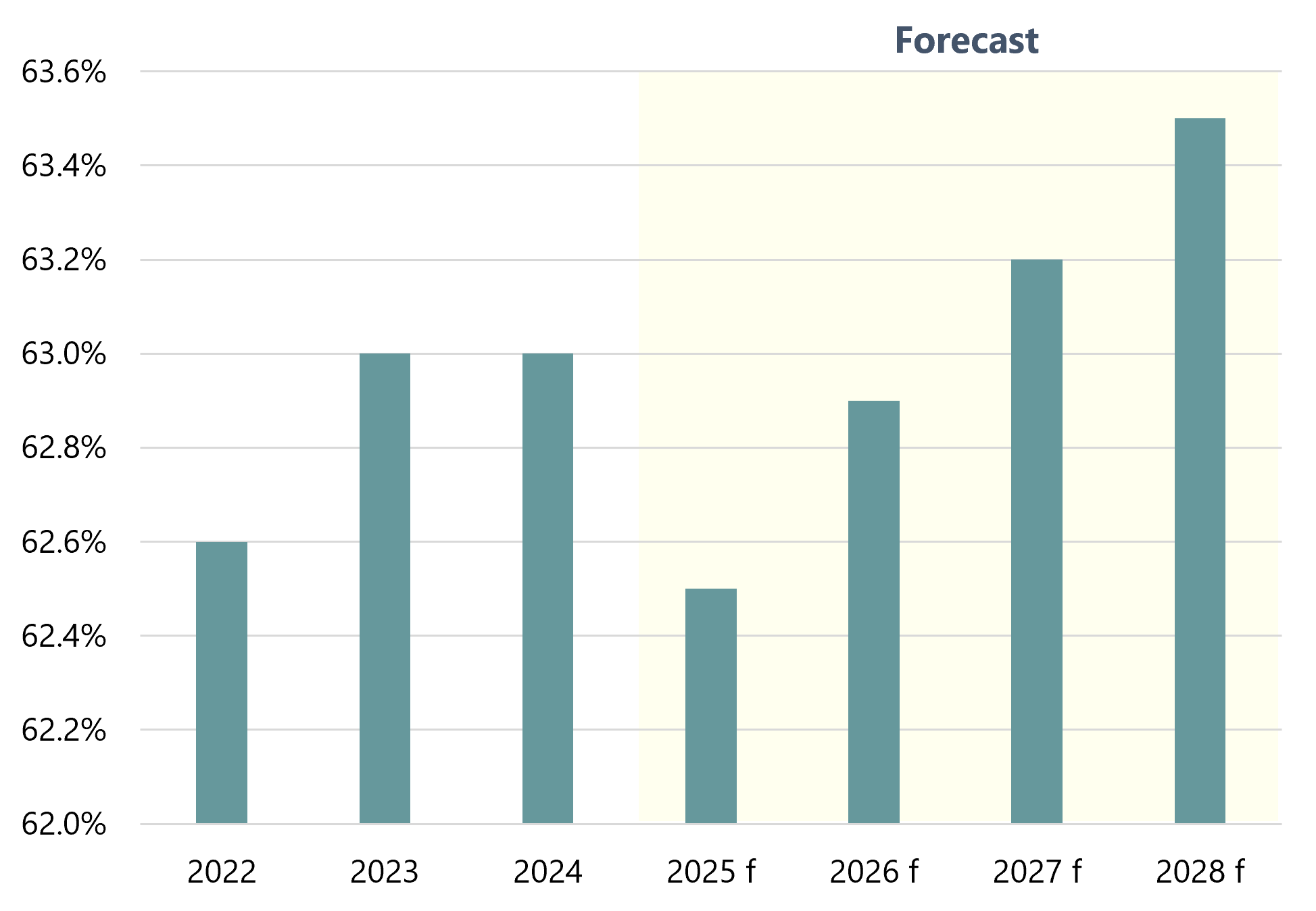 While demand has remained steady in 2025, topline performance has clearly flattened. HVS data through mid-year 2025 shows occupancy dipping in 2025 and ADR increases moderating after several years of strong post-pandemic recovery. Together, these trends indicate that revenue growth alone will no longer offset rising expenses, setting the stage for a more cost-sensitive operating environment.Occupancy Anticipated to Dip in 2025/26 Before Rebounding
