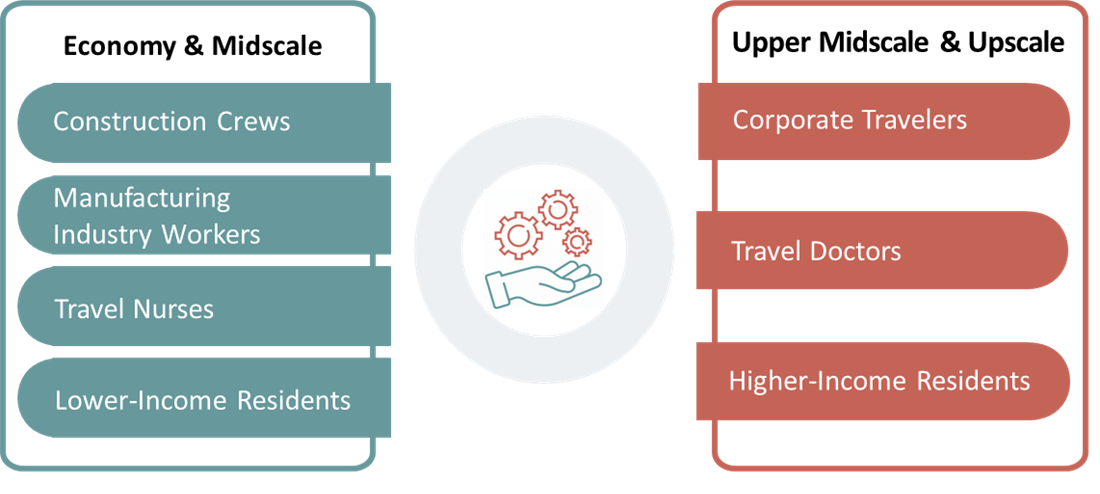 Extended-stay hotels range from economy to upscale chain scales. These hotels typically include kitchenettes in each guestroom and offer discounted rates for extended length of stays.The demand generators differ between the chain scales of extended-stay hotels as follows: