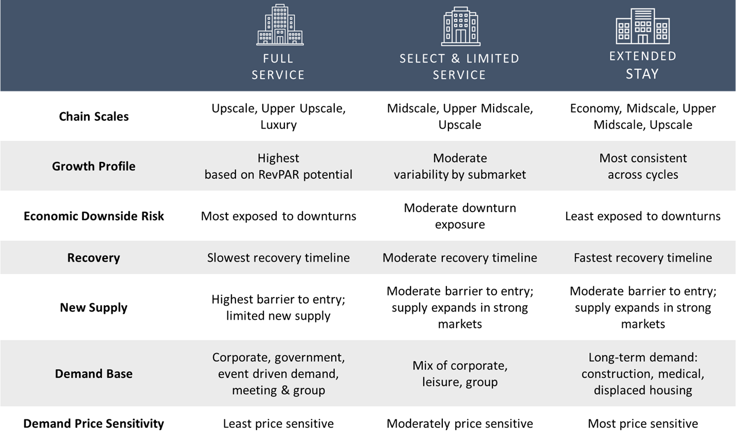 Full-service hotels also require the highest level of capital investment and operating expenses due to their extensive amenities and service offerings, which must be considered alongside their strong RevPAR performance.