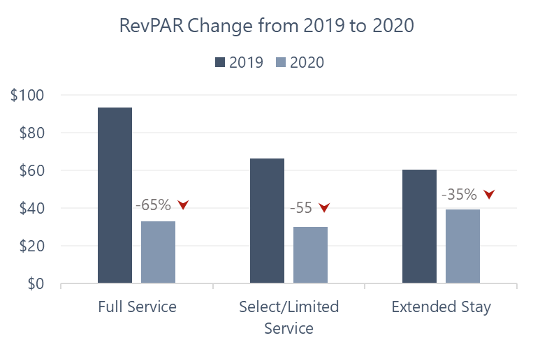 In 2020, hotel performance was influenced by the effects of the COVID-19 pandemic, as shown in the following table. While a significant decrease in demand was the primary reason for the decline in RevPAR, the impact on full-service hotels was further exacerbated by new supply entering the market in 2020, including the Loews Hotel.Extended-stay hotels experienced a less severe downturn in 2020, as a higher percentage of their demand was essential, including medical professionals, construction workers, or residents.